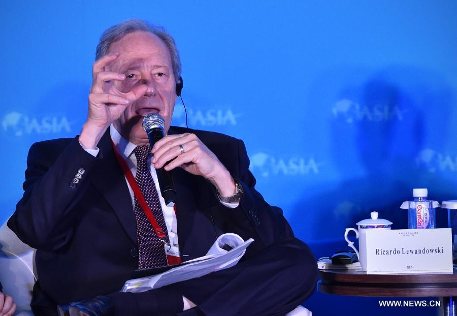 Richardo Lewandowski, President of the Federal Supreme Court of Brazil, speaks at a sub-forum with the theme of "BRICS Chief Justices' Dialogue: Pollution Control: the Power of Judiciary" during the 2015 Boao Forum for Asia (BFA) in Boao, south China's Hainan Province, March 29, 2015. (Xinhua/Zhao Yingquan)