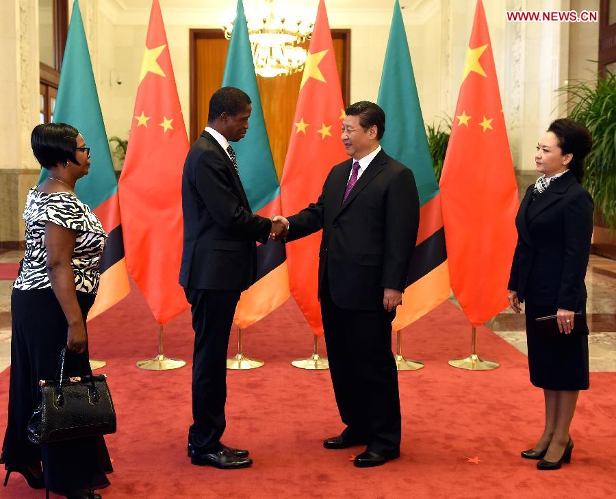 Chinese PresidentXi Jinping(2nd R) shakes hands with Zambian President Edgar Lungu (2nd L) at a welcome ceremony in Beijing, capital of China, March 30, 2015. (Xinhua/Rao Aimin)
