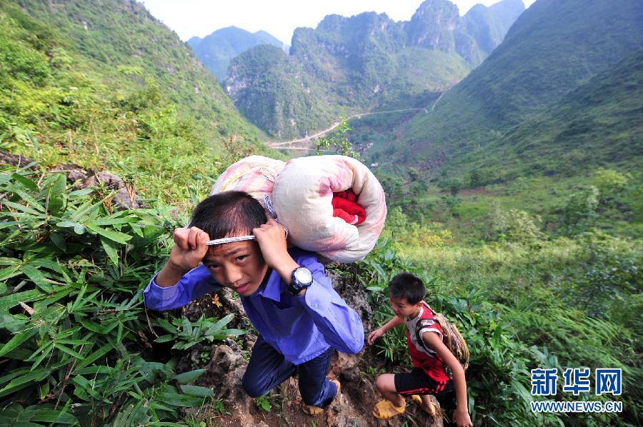 A student, carrying quits is on the way to Nongyong primary school on Sept. 3, 2012. (Xinhua/Huang Xiaobang)