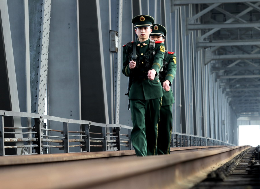 Soldiers go on patrol along the Songpu Bridge on March 29, 2015. (Xinhua/Chenfei)