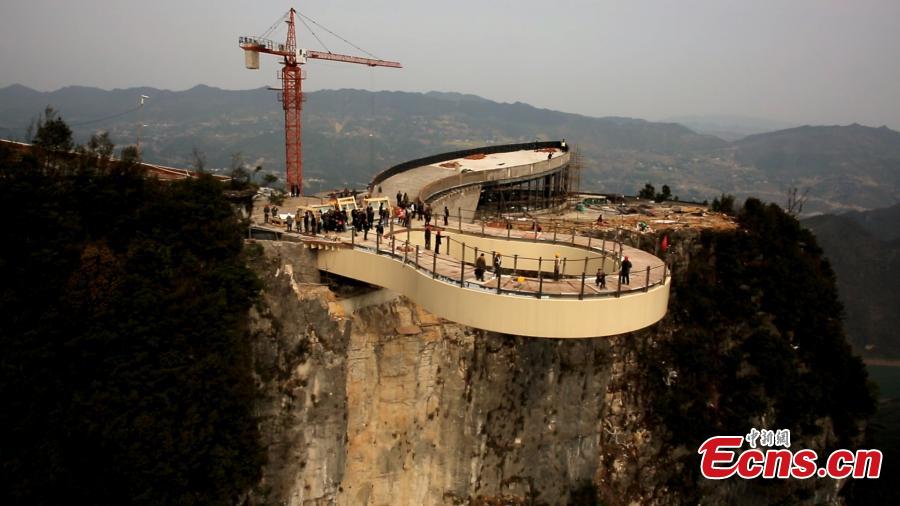 Workers are finishing the construction of a glass cantilever bridge in Longgang scenic area in Yunyang, Southwest China's Chongqing municipality. The transparent structure, 718 meters above the ground, has a cantilever extending 26.64 meters from the edge, five meters longer than the Grand Canyon Skywalk. The project, with a total investment of 35 million yuan($5.6 million), started in March 2014. The bridge has a carrying capacity of 1000 tons.(Photo: China News Service/Zhong Xin)