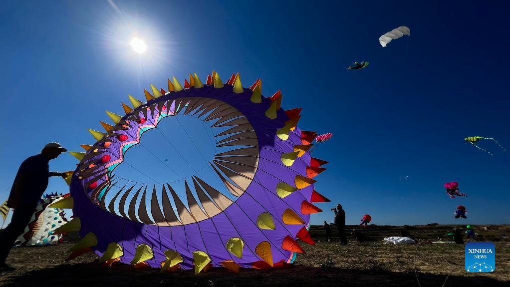 A man prepares to fly a kite during the 4th edition of the International Kite and Wind Festival in the village of Gharb on the island of Gozo, Malta, on Oct. 17, 2021. (Xinhua/Jonathan Borg)