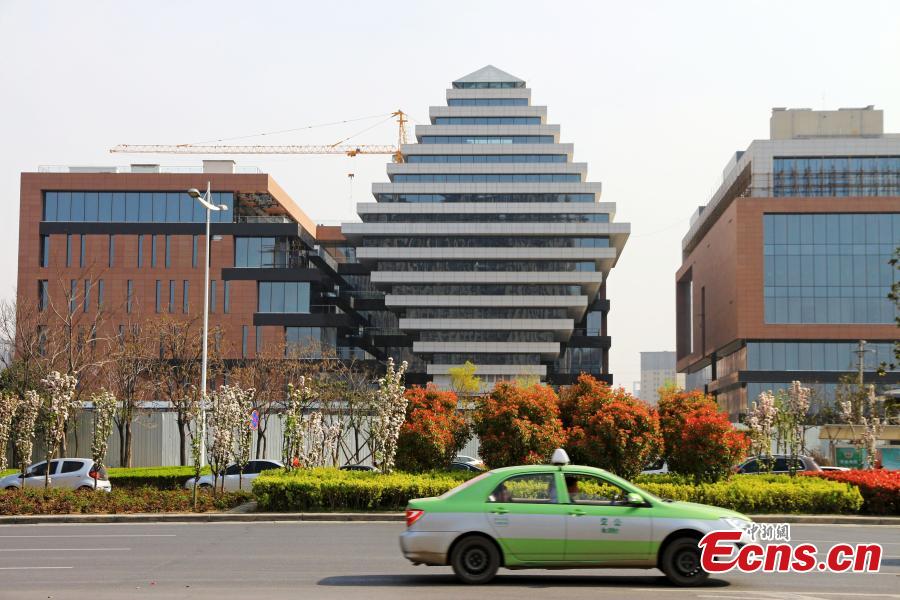 A spinning top-shaped building is under construction in Zhengzhou, Central China's Henan province, March 29, 2015. (Photo: China News Service/Wang Zirui)