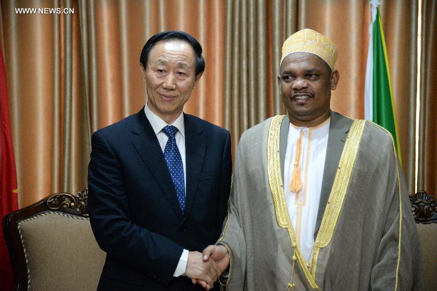 | Wang Jiarui (L), vice chairman of the National Committee of the Chinese People's Political Consultative Conference, also head of the International Department of the Communist Party of China (CPC) Central Committee, meets with Ikililou Dhoinine, President of the Union of the Comoros, in Moroni, capital of Comoro, March 30, 2015. (Xinhua/Dong Ruifeng) |