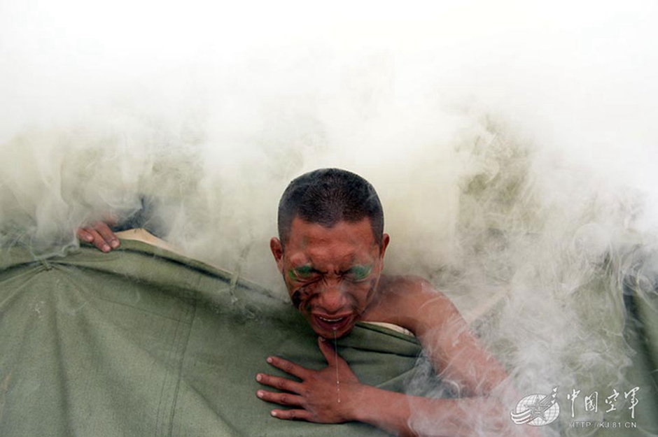 Soldiers have to stay in a tent filled with smoke for half an hour without any protection. (81.cn/Yu Hongchun, Jiang Long)