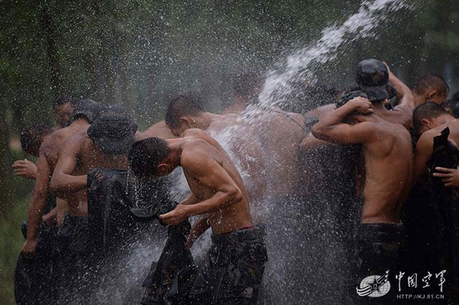 Soldiers shower with high-pressure water gun. (81.cn/Yu Hongchun, Jiang Long)