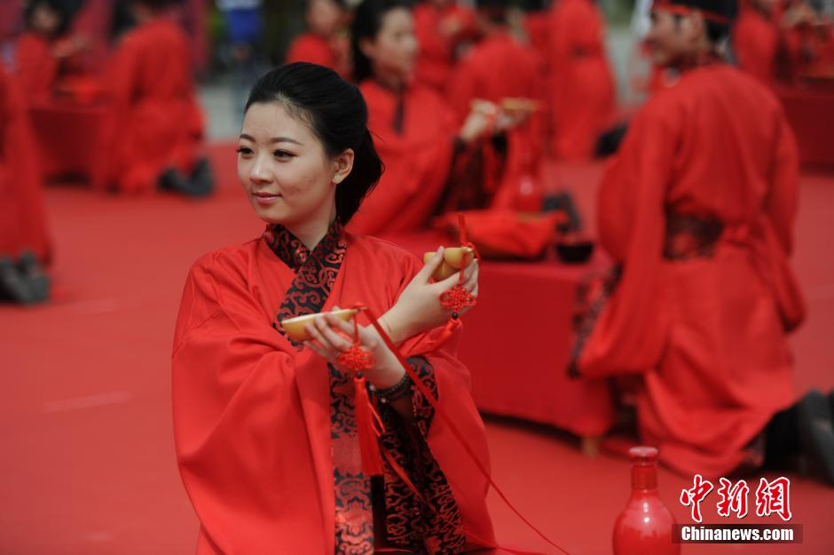 A group wedding ceremony is held in Hefei, Anhui province on March 29, 2015. 30 new couples in Han Chinese costumes perform a series of Han traditional wedding rituals. (CNS/Zhang Yayu)
