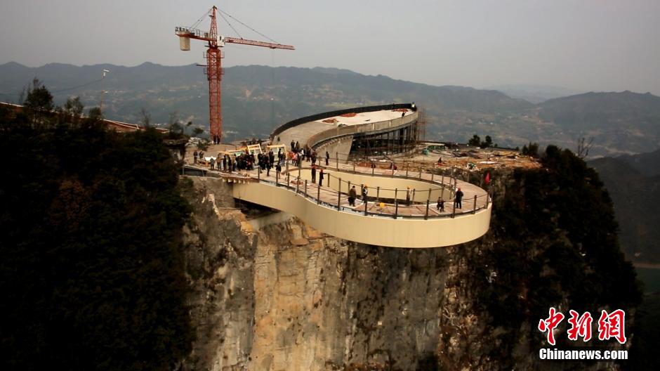 The world's longest glass cantilever bridge in Yunyang county, Chongqing, will be opened to tourists on May 1. The "Cloud bridge" is built on top of the cliffs 1,123 meters above sea level. The bridge is about 3.4 meters wide and 50 meters long, with a shape of flower. When one stands on it, he will feel totally "suspended" in the air without any line in sight. (Photo/CNS)