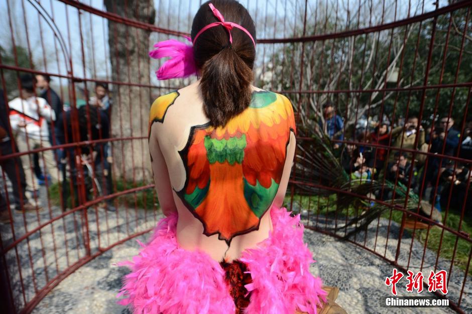 Lately a peacock themed body painting show was held in a giant birdcage in Yangzhou. Many citizens were attracted to the scene when artists painted on the bodies of the models. (Chinanews/Meng Delong)