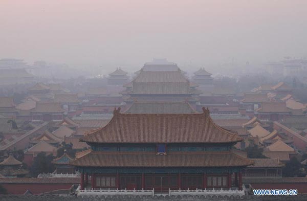 | The Palace Museum, or the Forbidden City, is shrouded in smog in Beijing, capital of China, Jan. 4, 2015. China's top meteorological authority forecast medium to severe smog in the country's northern regions including Beijing and Tianjin as well as the neighboring Hebei Province on Sunday. Meanwhile, smoggy weather will also affect the country's eastern province of Jiangsu as well as the southwestern province of Sichuan on Sunday. (Xinhua/Liu Xianguo) |