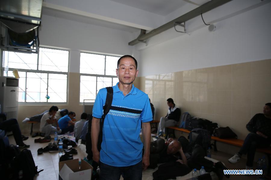 A Chinese evacuee stands at the temporary rest center in Hassan Gouled in Djibouti, March 31, 2015. More than 500 Chinese evacuees from conflict-ridden Yemen have arrived at the Djibouti port as the situation continues to deteriorate in Yemen. (Xinhua/Pan Siwei)