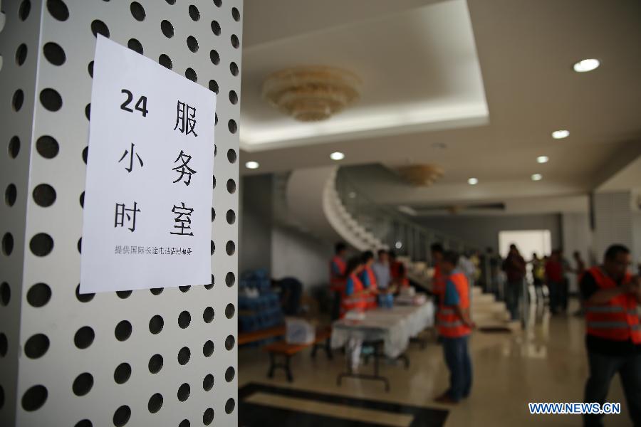 Vorlunteers work at a 24-hours service room at the temporary rest center in Hassan Gouled in Djibouti, March 31, 2015. More than 500 Chinese evacuees from conflict-ridden Yemen have arrived at the Djibouti port as the situation continues to deteriorate in Yemen. (Xinhua/Pan Siwei)