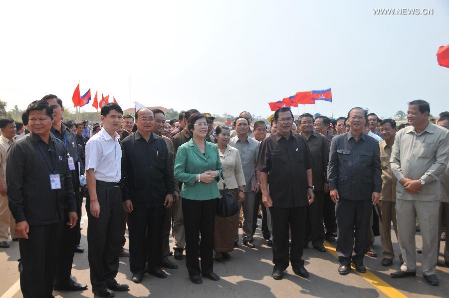 Cambodian Prime Minister Hun Sen (3rd R Front) and Chinese Ambassador to Cambodia Bu Jianguo (4th L Front) attend the inauguration ceremony of a bridge and a road in Stung Treng province, Cambodia, April 1, 2015. Cambodia inaugurated a 1.73km Mekong River bridge, along with a 143km road, here on Wednesday in a bid to boost economic development and reduce poverty in this far northeastern region. (Xinhua/Li Hong)