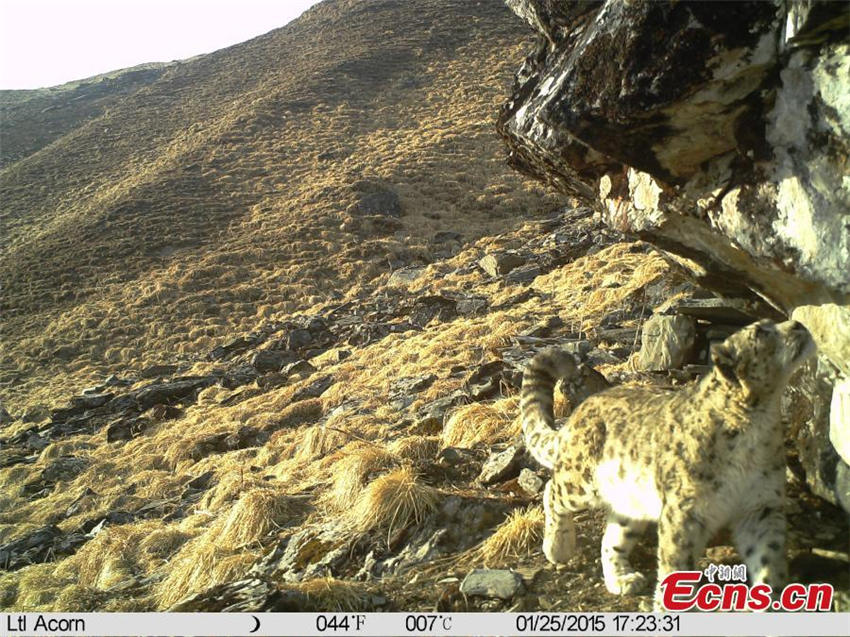 Picture of a snow leopard was captured by an infrared camera, set up at an altitude of 4,102 meters, at the Wolong National Nature Reserve in Southwest China’s Sichuan province, Jan. 1, 2015. In a short video clip, the snow leopard was also found roaming with its cub, about one year old, on the mountain. Snow leopards, one of China's Class A protected animals, are usually found in the Himalayan ranges of central and south Asia at altitudes between 3,000 and 5,500 meters. (Photo provided to China News Service)