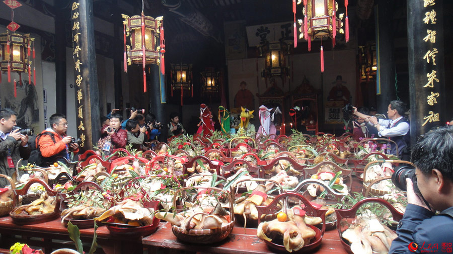 On March 30, 2015, tables in the ancestral temple are filled with well-decorated pig heads. (Photo source: people.cn)