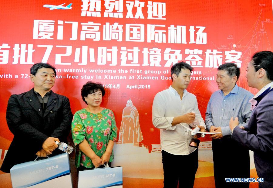 The first group of passengers with a 72-hour visa-free stay in Xiamen receive a reception at Xiamen Gaoqi International Airport in Xiamen, southeast China's Fujian Province, April 2, 2015. Xiamen started to allow 72-hour transit visa exemptions for foreign nationals from 51 countries and regions from Wednesday. (Xinhua/Lin Shanchuan)