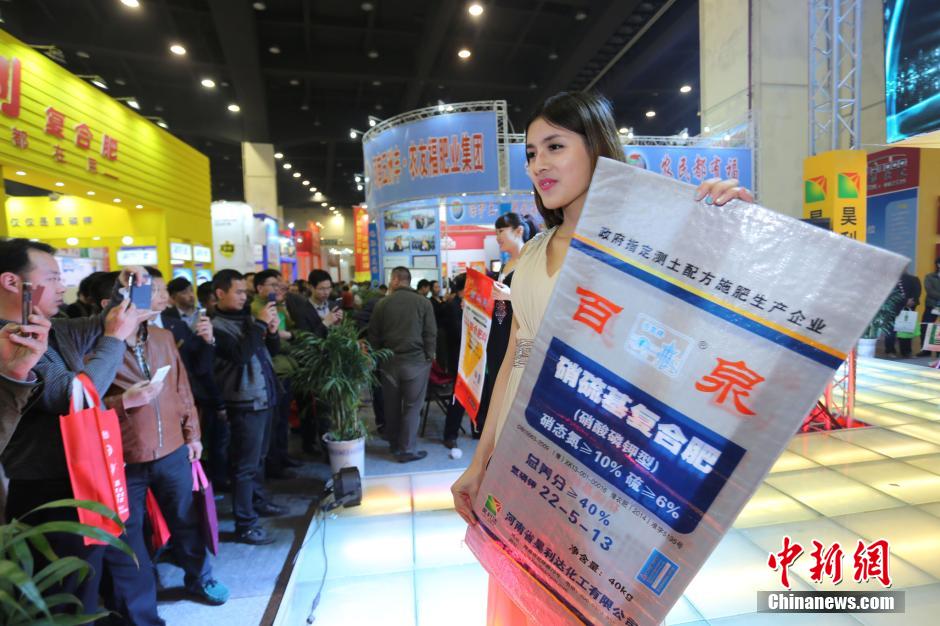Models pose with fertilizer advertisements at a fertilizer fair in Zhengzhou, central China's Henan province on April 1, 2015. (Photo/Chinanews.com)