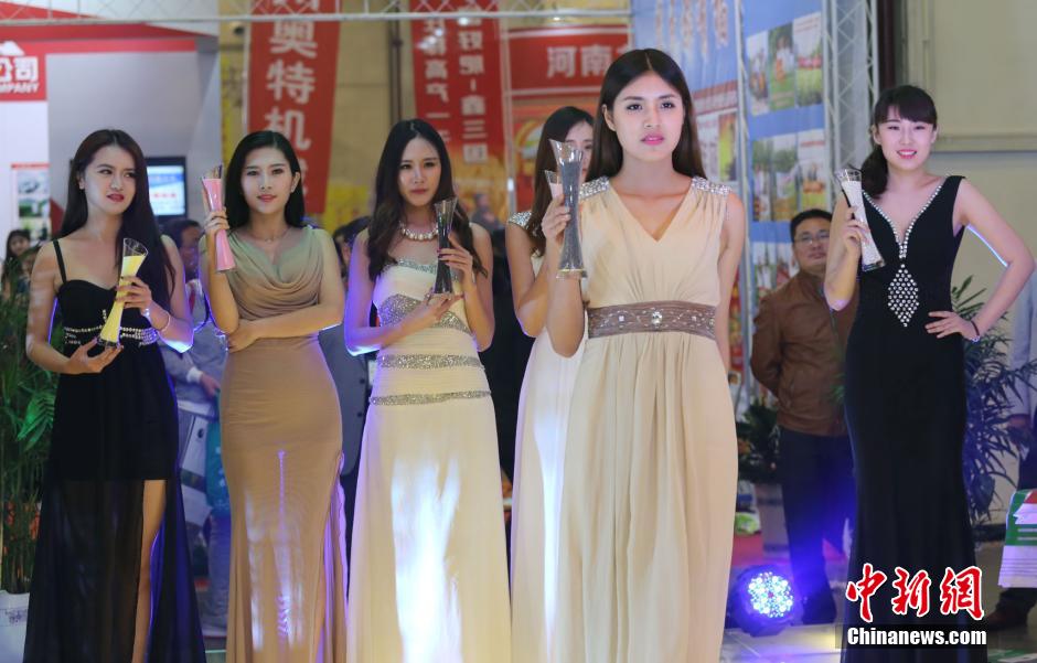 Models pose with fertilizer samples at a fertilizer fair in Zhengzhou, central China's Henan province on April 1, 2015. (Photo/Chinanews.com)