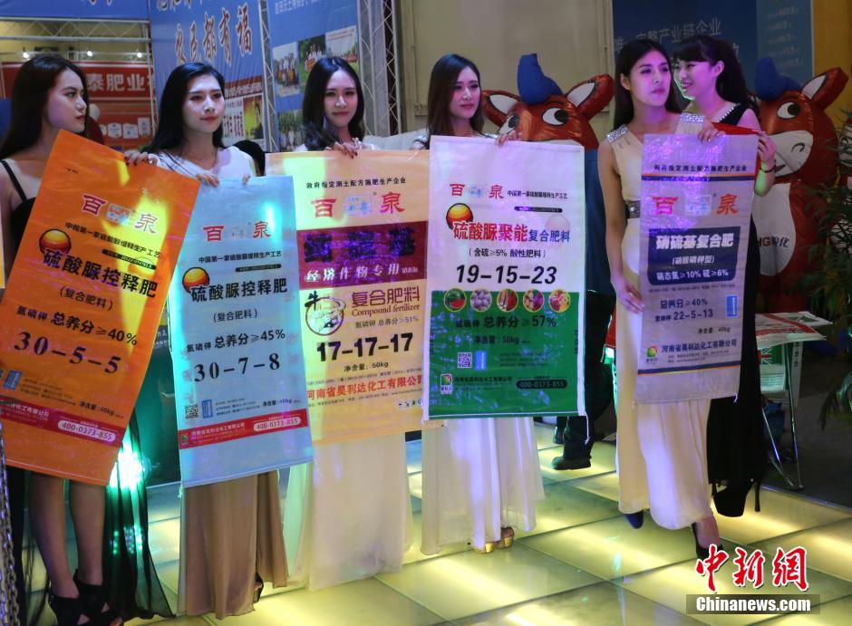 Models pose with fertilizer advertisements at a fertilizer fair in Zhengzhou, central China's Henan province on April 1, 2015. (Photo/Chinanews.com)