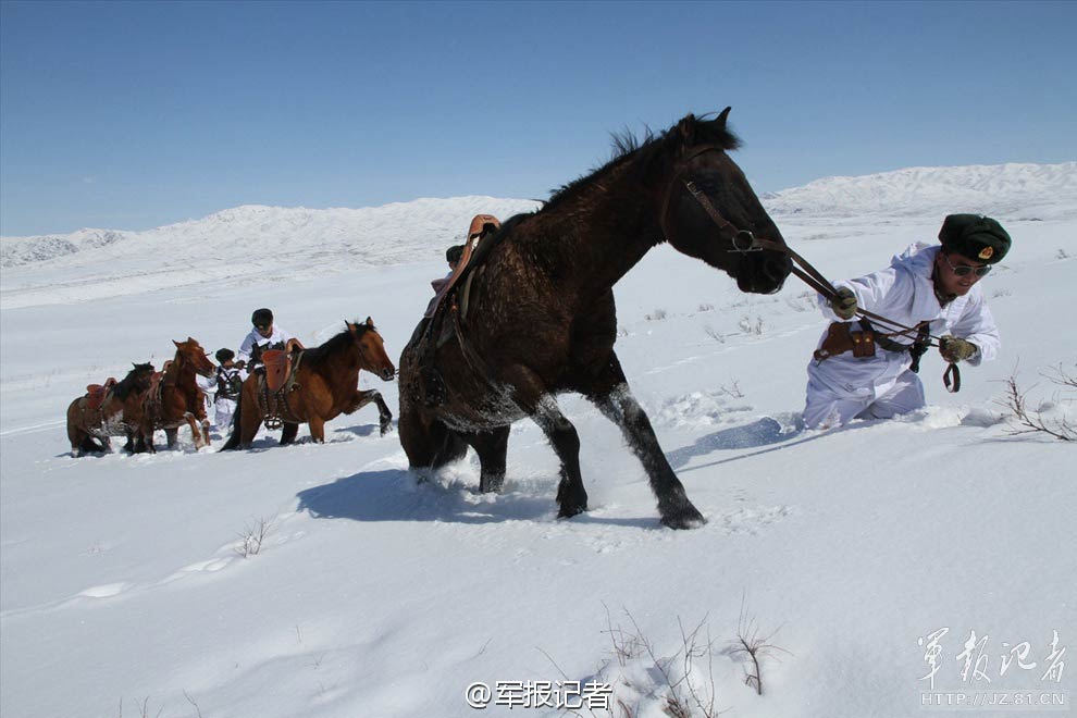Soldiers patrol the China-Kazakhstan border line below the Tarbagatai Mountains, northwest China’s Xinjiang Uyghur Autonomous Region, April 1, 2015. Heavy snow hit northern part of Xinjiang recently; soldiers braved the cold of minus 10 degrees Celsius in guarding the security of the border line. (Photo/JZ.81.CN)