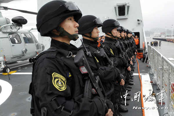 Special operation team members line up on the deck of the missile destroyer Jinan on April 3, 2015. The 20th Chinese naval escort taskforce departs from a military port in Zhoushan, east China's Zhejiang province, and head for the Gulf of Aden and waters off Somali coast on the morning of April 3, 2015, to take over the escort mission from the 19th escort taskforce.(Photo: Chinamil.com.cn/Dai Zongfeng)
