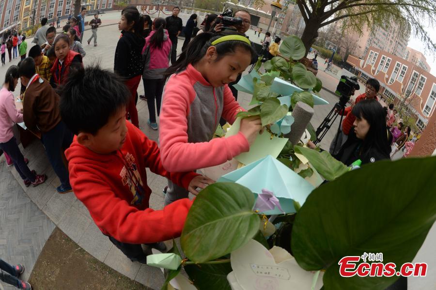Students write to mourn for departed relatives and martyrs in Beijing, April 3, 2015. China's traditional Qingming Festival, or Tomb-sweeping Day, falls on April 5 this year. (Photo: China News Service/Wei Ying)