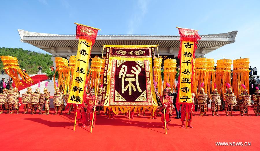 A ceremony is held to honor Huangdi, or the Yellow Emperor, who is considered as the ancestor of the Chinese nation, on Qingming Festival in Huangling County, northwest China's Shaanxi Province, April 5, 2015. (Xinhua/Ding Haitao)
