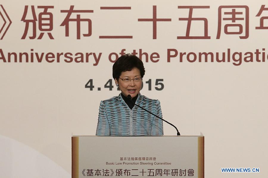 | Carrie Lam Cheng Yuet-ngor, Chief Secretary for Administration of Hong Kong, speaks at a seminar for the 25th anniversary of the promulgation of the Basic Law in south China's Hong Kong, April 4, 2015. The Basic Law, adopted on April 4, 1990, embodies the vision of "one country, two systems," a pragmatic solution allowing China to incorporate the political and economic complexities of Hong Kong. (Xinhua/Lui Siu Wai) |