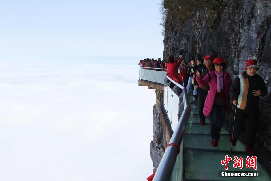 A sea of clouds appears at Tianmen mountain at Zhangjiajie, central China's Hunan province on March 30, 2015. Tourists can even see the light of Buddha under the glass plank road. (CNS/Ding Yunjuan)