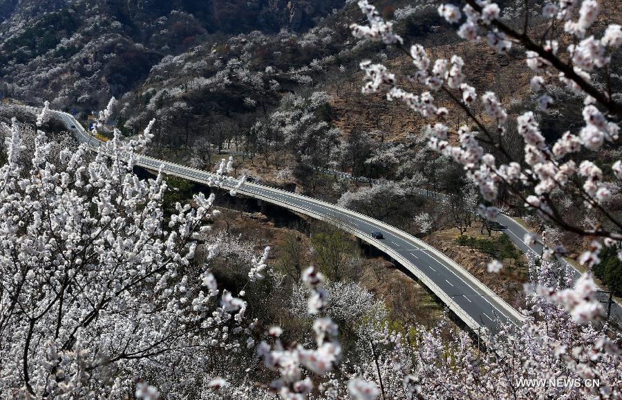 Flowers are in full blossom near the No. 111 national road in the Huairou District of Beijing, capital of China, April 7, 2015. (Xinhua/Bu Xiangdong)
