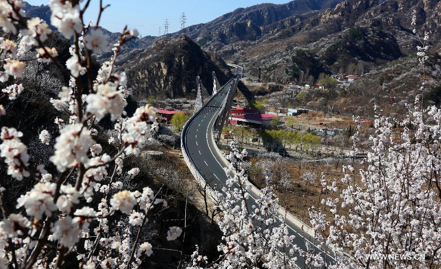 Flowers are in full blossom near the No. 111 national road in the Huairou District of Beijing, capital of China, April 7, 2015. (Xinhua/Bu Xiangdong)