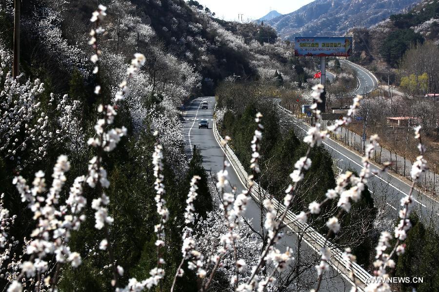 Flowers are in full blossom near the No. 111 national road in the Huairou District of Beijing, capital of China, April 7, 2015. (Xinhua/Bu Xiangdong)