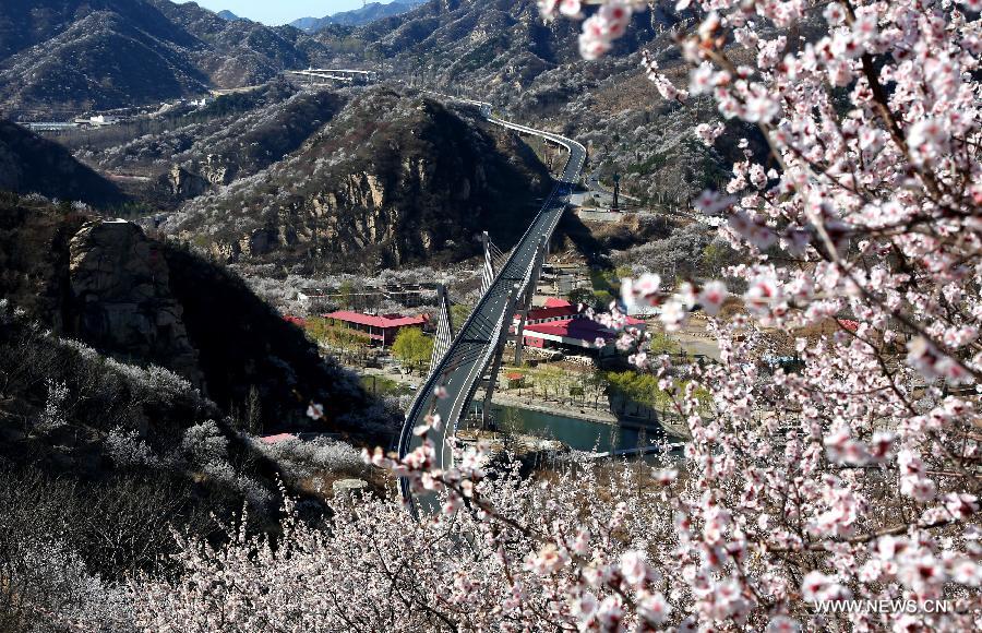 | Flowers are in full blossom near the No. 111 national road in the Huairou District of Beijing, capital of China, April 7, 2015. (Xinhua/Bu Xiangdong) |