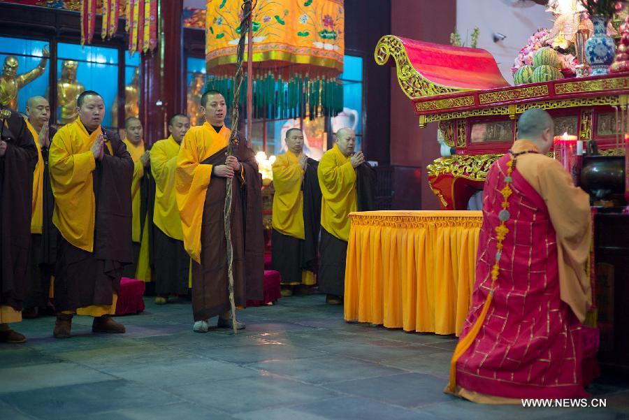 Monks take part in a Buddhist ritual to celebrate the birthday of Bodhisattva Guanyin at Qiyuan Temple on Jiuhua Mountain, east China's Anhui Province, April 7, 2015. Jiuhua Mountain, one of the four sacred mountains of Chinese Buddhism, ususally hold various Buddhist rituals and events on the birthday of Bodhisattva Guanyin, which falls on the 19th day of the second month in the lunar calender. (Xinhua/Guo Chen)