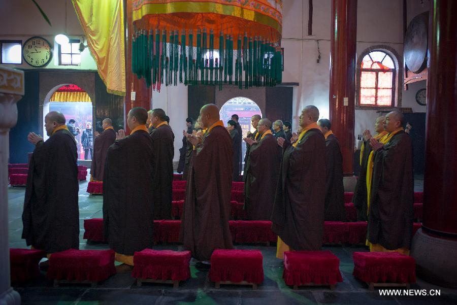 Monks take part in a Buddhist ritual to celebrate the birthday of Bodhisattva Guanyin at Qiyuan Temple on Jiuhua Mountain, east China's Anhui Province, April 7, 2015. Jiuhua Mountain, one of the four sacred mountains of Chinese Buddhism, ususally hold various Buddhist rituals and events on the birthday of Bodhisattva Guanyin, which falls on the 19th day of the second month in the lunar calender. (Xinhua/Guo Chen)