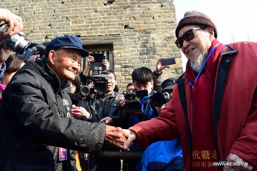 Veterans Shao Jingdou and Jiang Siyu, who are 101 and 102 years old respectively, shake hands in front of a bullet-hit wall at the Relics Park of the Tai'erzhuang Battle during a ceremony to celebrate the 77th anniversary of the victory of the battle in Tai'erzhuang, east China's Shandong Province, April 8, 2015. The Tai'erzhuang Battle, a battle of the Anti-Japanese War (1937-1845) in 1938 between Chinese and Japanese armies, was the first major Chinese victory of the war. It humiliated the Japanese military and its reputation as an invincible force. Meanwhile, it greatly boosted morale of Chinese people. (Xinhua/Guo Xulei)