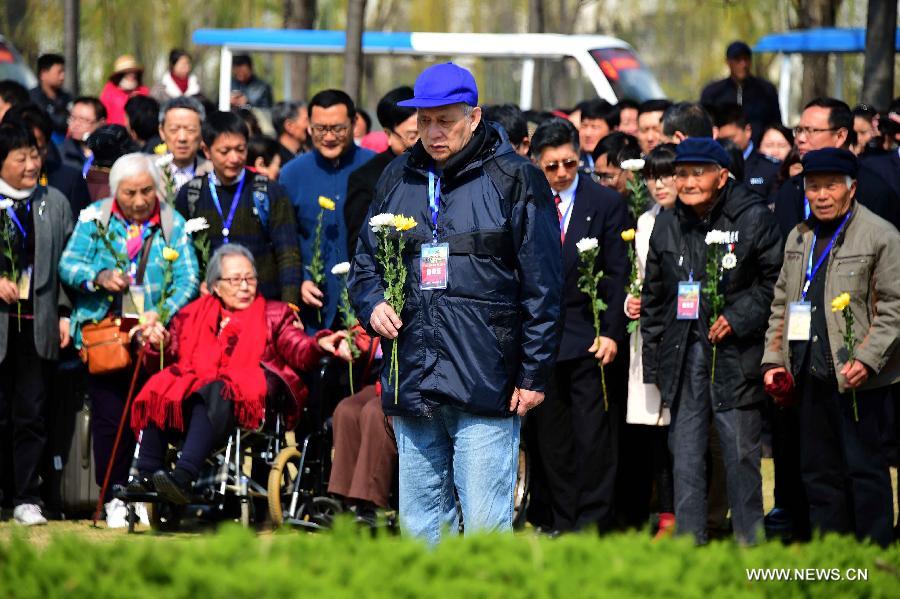 Zhang Jizu, grandson of late general Zhang Zizhong, mourn in front of a tomb of the unknown soldiers at the Relics Park of the Tai'erzhuang Battle during a ceremony to celebrate the 77th anniversary of the victory of the battle in Tai'erzhuang, east China's Shandong Province, April 8, 2015. The Tai'erzhuang Battle, a battle of the Anti-Japanese War (1937-1845) in 1938 between Chinese and Japanese armies, was the first major Chinese victory of the war. It humiliated the Japanese military and its reputation as an invincible force. Meanwhile, it greatly boosted morale of Chinese people. (Xinhua/Guo Xulei)