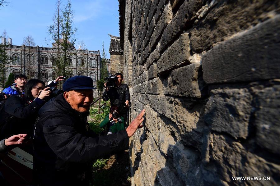Veteran Shao Jingdou, 101, touches the bullet holes on a wall at the Relics Park of the Tai'erzhuang Battle during a ceremony to celebrate the 77th anniversary of the victory of the battle in Tai'erzhuang, east China's Shandong Province, April 8, 2015. The Tai'erzhuang Battle, a battle of the Anti-Japanese War (1937-1845) in 1938 between Chinese and Japanese armies, was the first major Chinese victory of the war. It humiliated the Japanese military and its reputation as an invincible force. Meanwhile, it greatly boosted morale of Chinese people. (Xinhua/Guo Xulei)