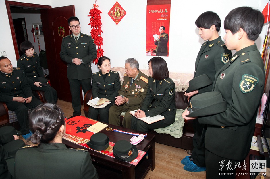Du Xiaodan and other soldiers visit an honored veteran. (Photo/81.cn)