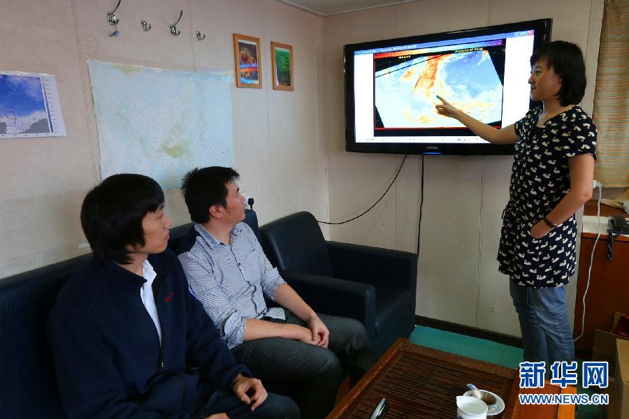 Photo taken on March 16, 2015 shows captain Zhao Yanping (C) having a meeting with meteorologists Huang Huanqing (R) and Zhang Chi on Xuelong. (Photo/Xinhua)