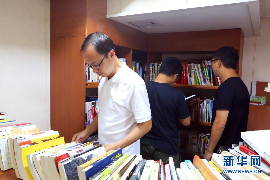Photo taken on Dec. 10, 2014 shows crew members in the library on Xuelong. (Photo/Xinhua)