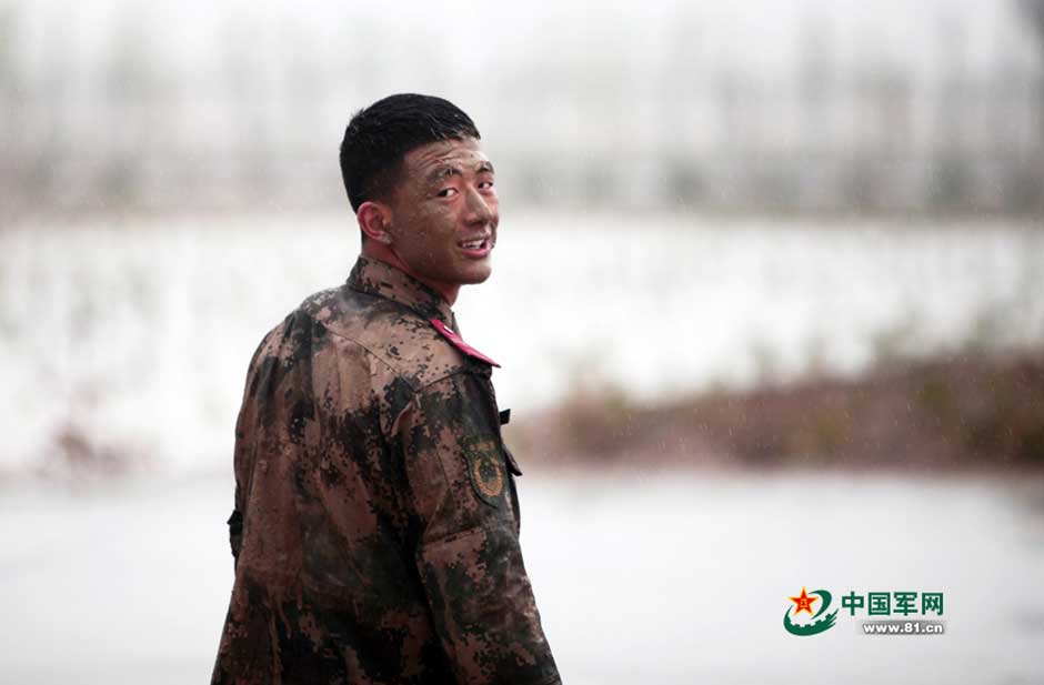 Yinchuan, northwest China's Ningxia Hui Autonomous Region, saw a moderate rain on April 1, 2015. SWAT officers there trained in mire to improve their restraint techniques and fighting skills on that day.(Photo/81.cn)