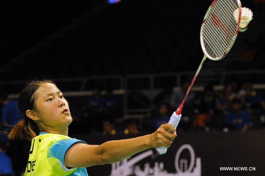 Singapore's Chen Jiayuan returns a shot during the women's singles match against Iris Wang of the United States at the OUE Singapore Open in Singapore, April 8, 2015. Chen Jiayuan won 2-1. (Xinhua/Then Chih Wey)