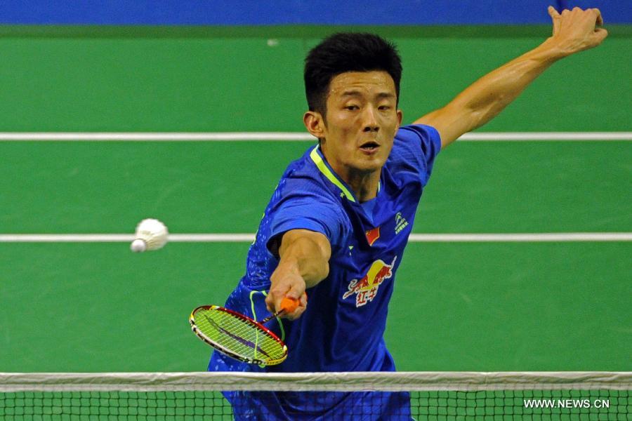 Chen Long of China returns a shot during the men's singles match against Lee Dong Keun of South Korea at the OUE Singapore Open in Singapore, April 8, 2015. Chen Long won 2-0.(Xinhua/Then Chih Wey)