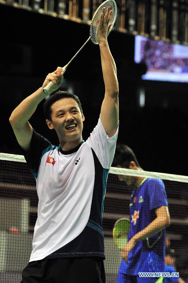 Hu Yun (L) of China's Hong Kong celebrates after winning the men's singles second round match of the OUE Singapore Open against Chen Long of China in Singapore, April 9, 2015. Hu Yun won 2-1. (Xinhua/Then Chih Wey)