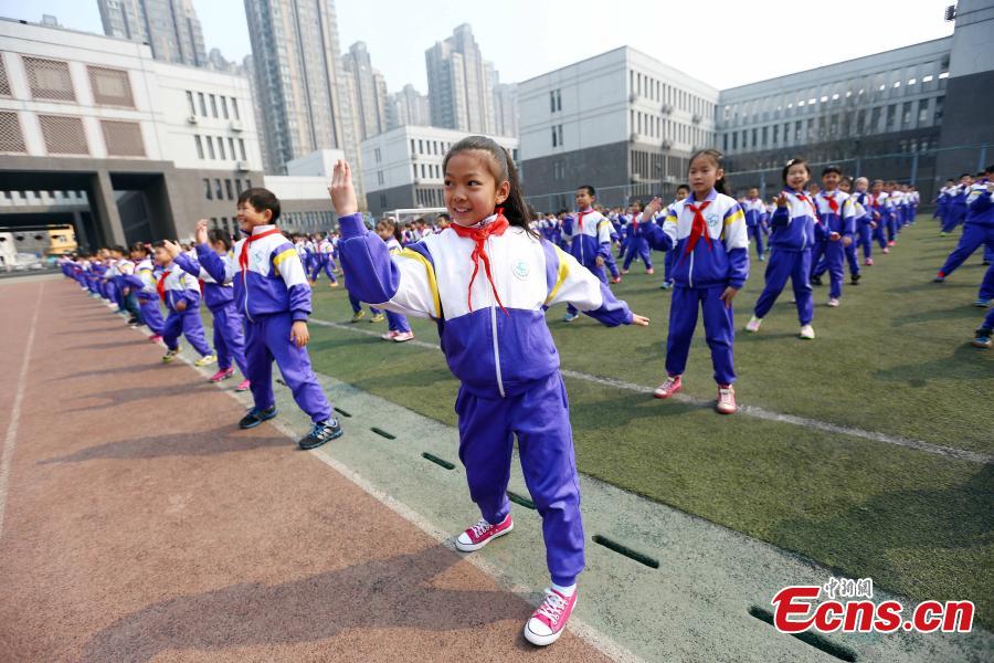 | More than 3,000 students dance to the adapted version of Chinese upbeat song “Little Apple” during the class break at an elementary school in Tianjin. (Photo: China News Service/Tong Yu) |