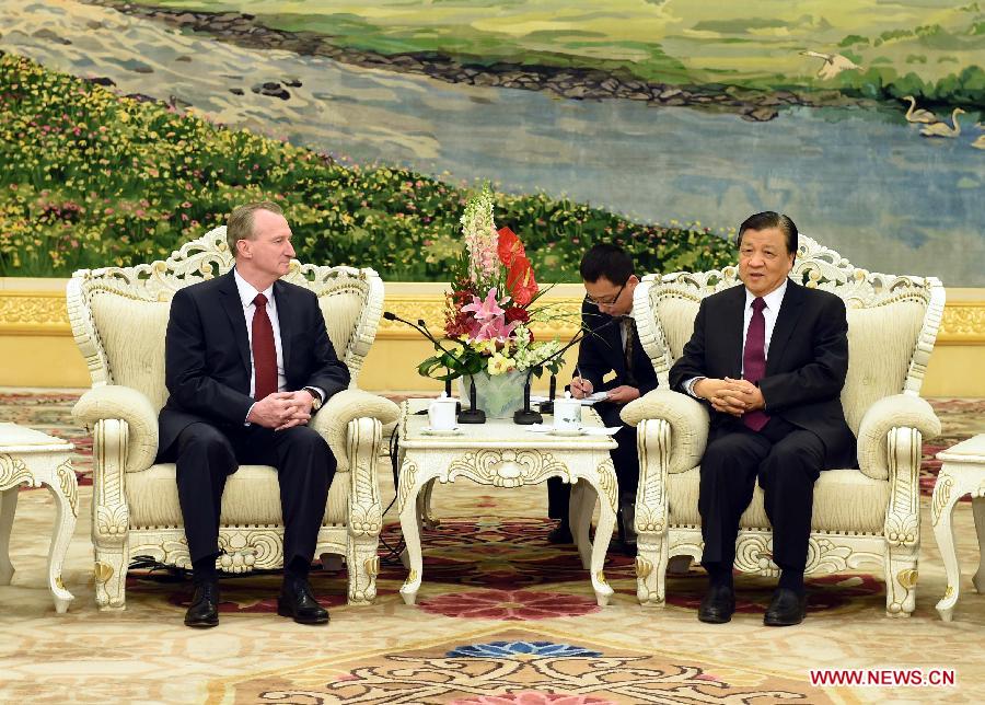 Liu Yunshan(R), a member of the Standing Committee of the Political Bureau of the Communist Party of China Central Committee, meets with a delegation led by Alexander Kosinets, head of Belarus President Administration, in Beijing, capital of China, April 9, 2015. (Xinhua/Rao Aimin)