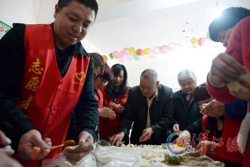 | Volunteers make dumplings with elderly in Humulinxiang Community in Xiangyang on March 21.(Photo provided to People's Daily Online) |