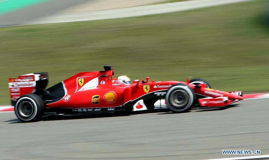 | Ferrari's German driver Sebastian Vettel drives his car during the first practice session of the Formula One Chinese Grand Prix in Shanghai, east China, April 10, 2015. (Xinhua/Fan Jun) |