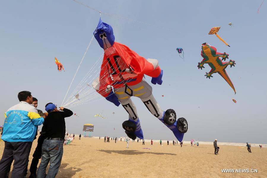 Participants fly kites during a kite fair held in Weifang, east China's Shandong Province, April 11, 2015. A total of 85 teams from all over the Weifang city took part in the fair on Saturday. (Xinhua/Zhang Chi)